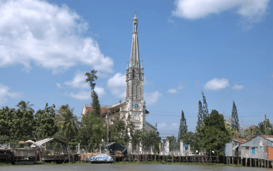 Nếu chùa Linh Thứu níu chân người bởi phong cách đơn giản trang nhã thì nhà thờ Cái Bè khiến người ta không thể rời mắt khỏi kiến trúc Roman cổ kính. Nhà thờ xây dựng theo kiểu kiến trúc Roman và bằng bê tông cốt thép đúc đá sạn, xây dựng năm 1929-1932, đến nay vẫn giữ nguyên vẻ đẹp cổ kính mơ màng.